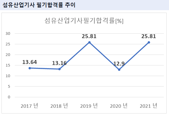 섬유산업기사 필기시험 합격률을 보면 2021년 기준 25.81%의 합격률을 기록하였습니다.