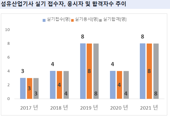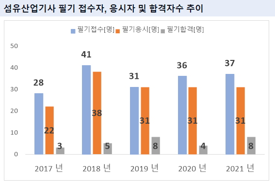 그리고, 섬유산업기사 필기시험에 최종 합격한 섬유산업기사 필기 합격자수는 2021년 기준 8명 입니다.