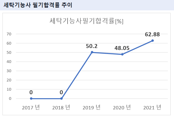 세탁기능사 필기시험 합격률을 보면 2021년 기준 62.88%의 합격률을 기록하였습니다.