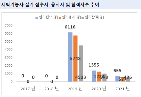 그리고, 최종적으로 세탁기능사 실기시험에 합격한 세탁기능사 실기시험 합격자수는 2021년 496명 입니다.