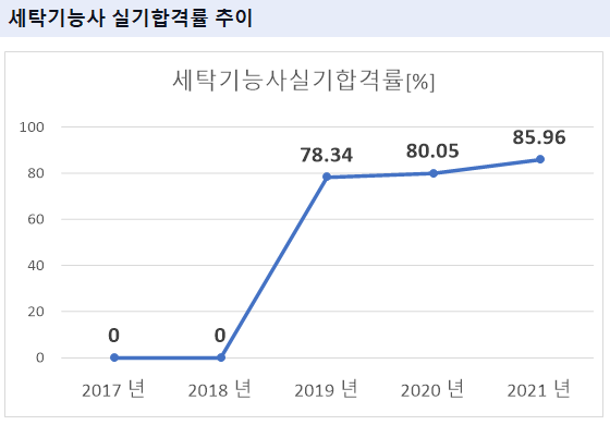 2021년 기준 세탁기능사 실기 합격률은 85.96% 입니다.