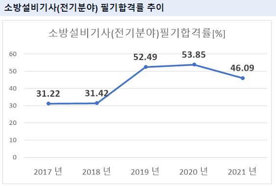 소방설비기사(전기분야) 필기시험 합격률을 보면 2021년 기준 46.09%의 합격률을 기록하였습니다.