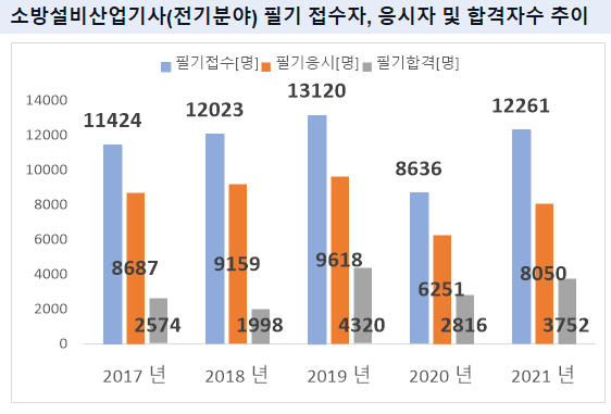 그리고, 소방설비산업기사(전기분야) 필기시험에 최종 합격한 소방설비산업기사(전기분야) 필기 합격자수는 2021년 기준 3752명 입니다.