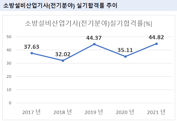 2021년 기준 소방설비산업기사(전기분야) 실기 합격률은 44.82% 입니다.