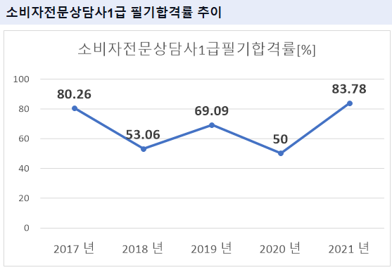 소비자전문상담사1급 필기시험 합격률을 보면 2021년 기준 83.78%의 합격률을 기록하였습니다.