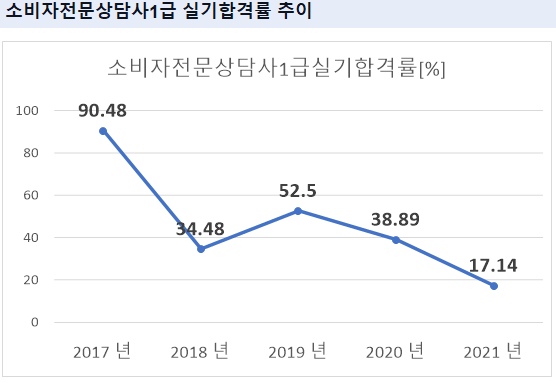 2021년 기준 소비자전문상담사1급 실기 합격률은 17.14% 입니다.