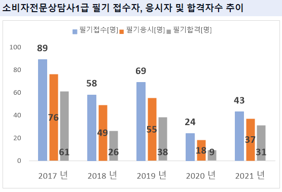 그리고, 소비자전문상담사1급 필기시험에 최종 합격한 소비자전문상담사1급 필기 합격자수는 2021년 기준 31명 입니다.