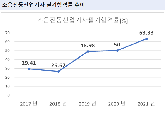 소음진동산업기사 필기시험 합격률을 보면 2021년 기준 63.33%의 합격률을 기록하였습니다.