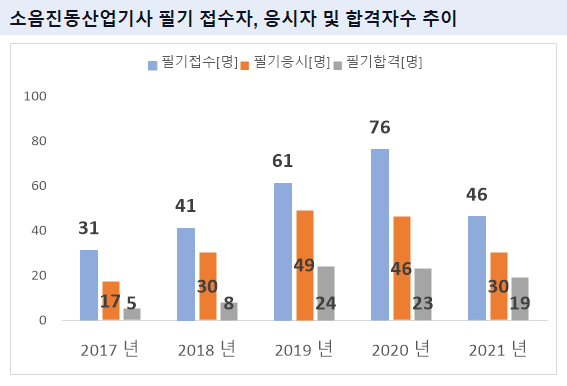 그리고, 소음진동산업기사 필기시험에 최종 합격한 소음진동산업기사 필기 합격자수는 2021년 기준 19명 입니다.