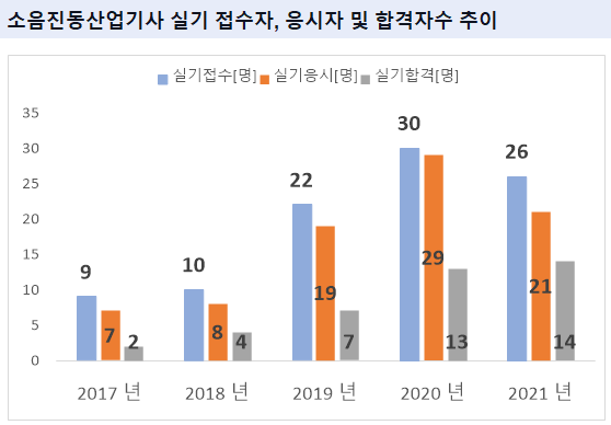 소음진동산업기사 실기시험 접수자는 2021년 기준 26명 입니다. 그리고 이중 실제로 소음진동산업기사 실기시험에 응시한 실기 응시자수는 21명 입니다.