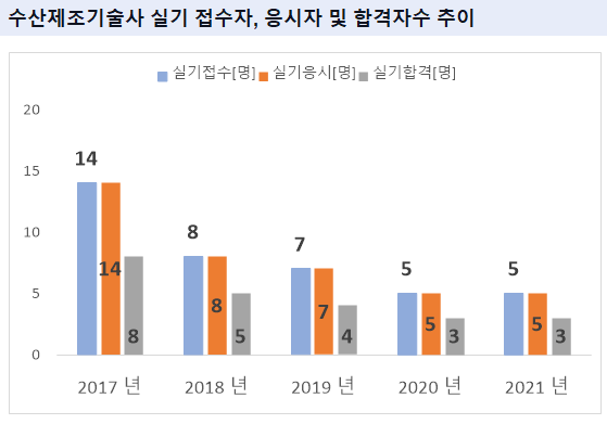그리고, 수산제조기술사 필기시험에 최종 합격한 수산제조기술사 필기 합격자수는 2021년 기준 3명 입니다.