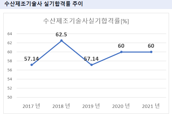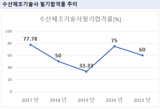 수산제조기술사 필기시험 합격률을 보면 2021년 기준 60%의 합격률을 기록하였습니다.