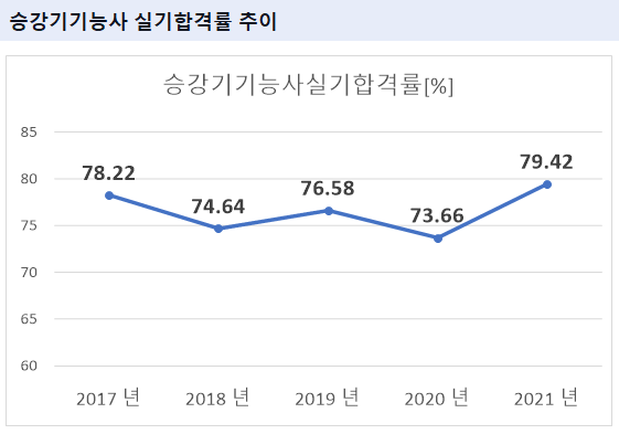 2021년 기준 승강기기능사 실기 합격률은 79.42% 입니다.