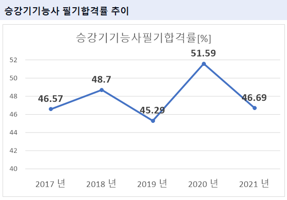 승강기기능사 필기시험 합격률을 보면 2021년 기준 46.69%의 합격률을 기록하였습니다.