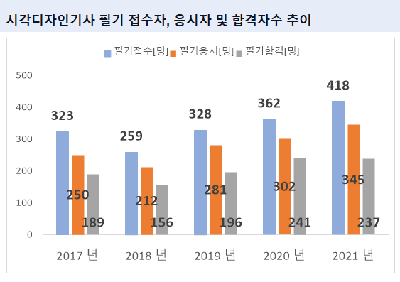 2021년 기준 시각디자인기사 필기시험 접수자는 418명 이었으며, 이중 실제로 시각디자인기사 필기시험에 응시한 응시자수는 345명 입니다.