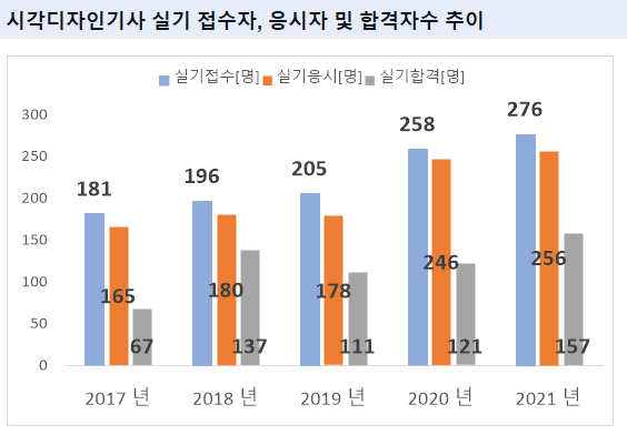 시각디자인기사 실기시험 접수자는 2021년 기준 276명 입니다. 그리고 이중 실제로 시각디자인기사 실기시험에 응시한 실기 응시자수는 256명 입니다.