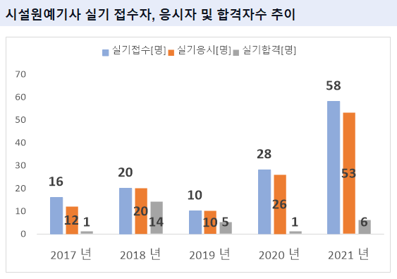 시설원예기사 실기시험 접수자는 2021년 기준 58명 입니다. 그리고 이중 실제로 시설원예기사 실기시험에 응시한 실기 응시자수는 53명 입니다.
