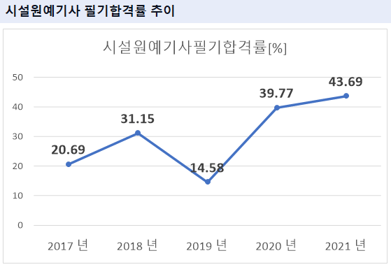 시설원예기사 필기시험 합격률을 보면 2021년 기준 43.69%의 합격률을 기록하였습니다.