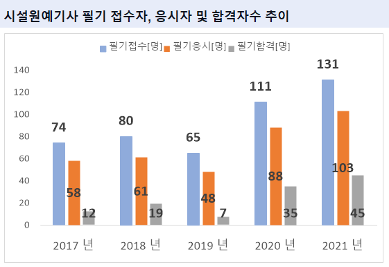 그리고, 시설원예기사 필기시험에 최종 합격한 시설원예기사 필기 합격자수는 2021년 기준 45명 입니다.