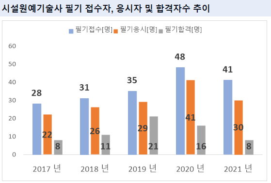 2021년 기준 시설원예기술사 필기시험 접수자는 41명 이었으며, 이중 실제로 시설원예기술사 필기시험에 응시한 응시자수는 30명 입니다.