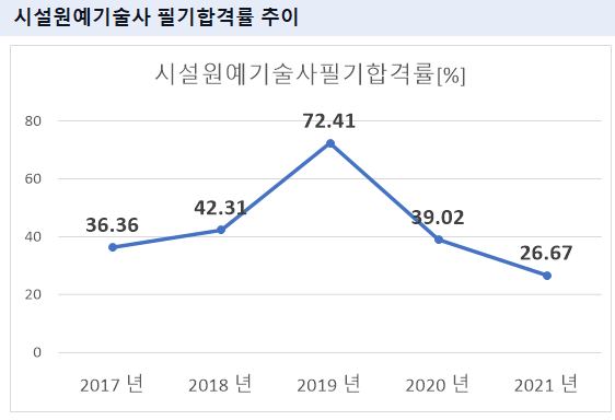 시설원예기술사 필기시험 합격률을 보면 2021년 기준 26.67%의 합격률을 기록하였습니다.