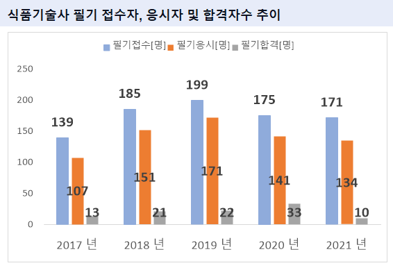 그리고, 식품기술사 필기시험에 최종 합격한 식품기술사 필기 합격자수는 2021년 기준 10명 입니다.
