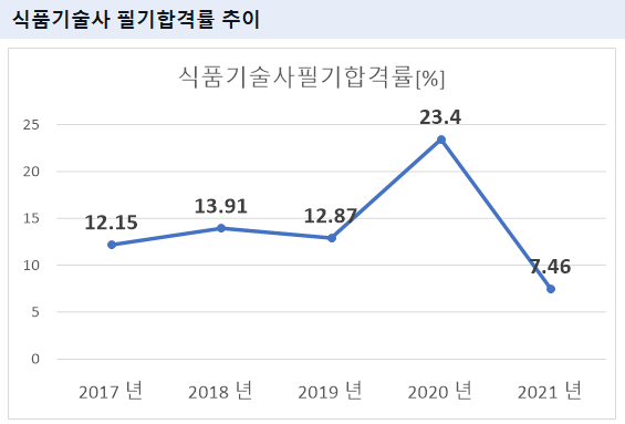 식품기술사 필기시험 합격률을 보면 2021년 기준 7.46%의 합격률을 기록하였습니다.