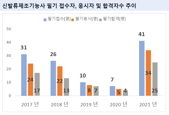그리고, 신발류제조기능사 필기시험에 최종 합격한 신발류제조기능사 필기 합격자수는 2021년 기준 25명 입니다.