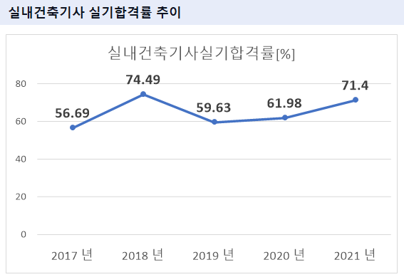2021년 기준 실내건축기사 실기 합격률은 71.4% 입니다.