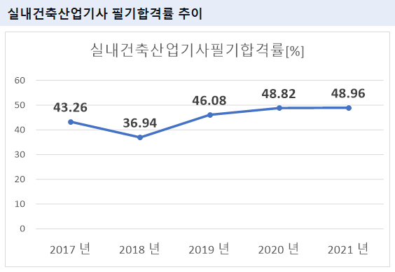 실내건축산업기사 필기시험 합격률을 보면 2021년 기준 48.96%의 합격률을 기록하였습니다.
