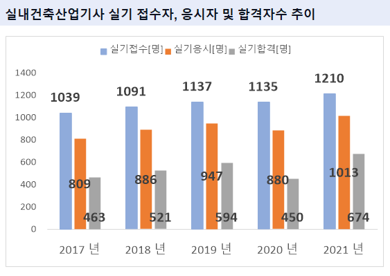 그리고, 실내건축산업기사 필기시험에 최종 합격한 실내건축산업기사 필기 합격자수는 2021년 기준 1107명 입니다.