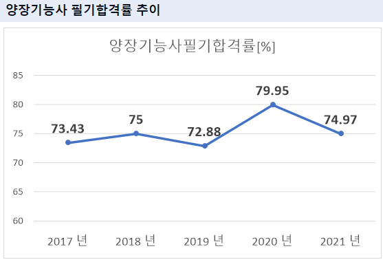 양장기능사 필기시험 합격률을 보면 2021년 기준 74.97%의 합격률을 기록하였습니다.
