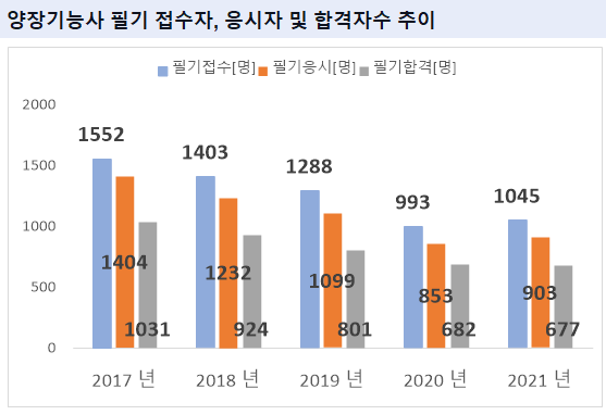 2021년 기준 양장기능사 필기시험 접수자는 1045명 이었으며, 이중 실제로 양장기능사 필기시험에 응시한 응시자수는 903명 입니다.