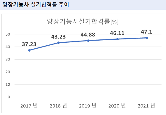 2021년 기준 양장기능사 실기 합격률은 47.1% 입니다.