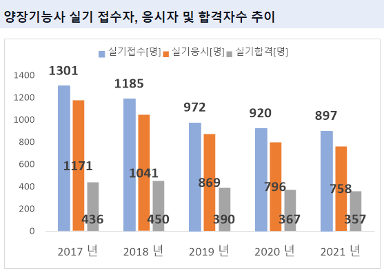 양장기능사 실기시험 접수자는 2021년 기준 897명 입니다. 그리고 이중 실제로 양장기능사 실기시험에 응시한 실기 응시자수는 758명 입니다.