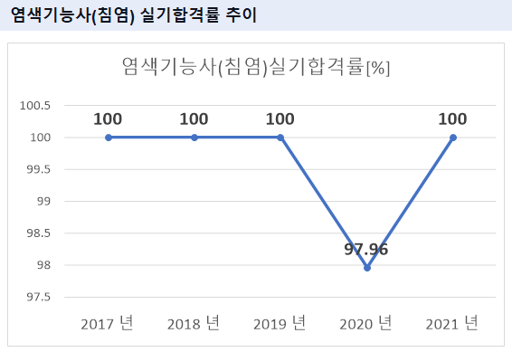 2021년 기준 염색기능사(침염) 실기 합격률은 100% 입니다.