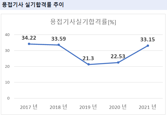 2021년 기준 용접기사 실기 합격률은 33.15% 입니다.