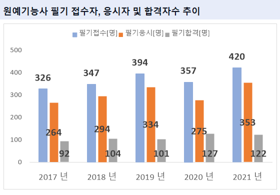 그리고, 원예기능사 필기시험에 최종 합격한 원예기능사 필기 합격자수는 2021년 기준 122명 입니다.
