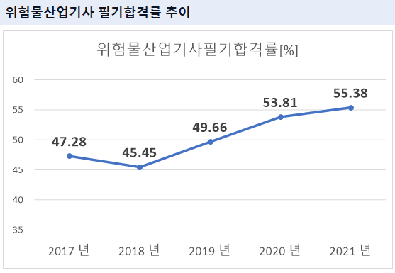 위험물산업기사 필기시험 합격률을 보면 2021년 기준 55.38%의 합격률을 기록하였습니다.