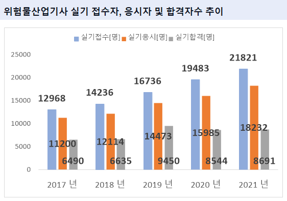 안녕하세요? 오늘은 위험물산업기사 합격률 및 위험물산업기사 실기 필기 응시자수 추이에 대해 연도별로 자세하게 알아보겠습니다.