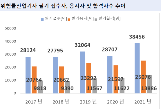 그리고, 위험물산업기사 필기시험에 최종 합격한 위험물산업기사 필기 합격자수는 2021년 기준 13886명 입니다.