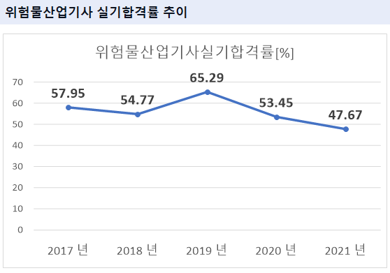 2021년 기준 위험물산업기사 실기 합격률은 47.67% 입니다.