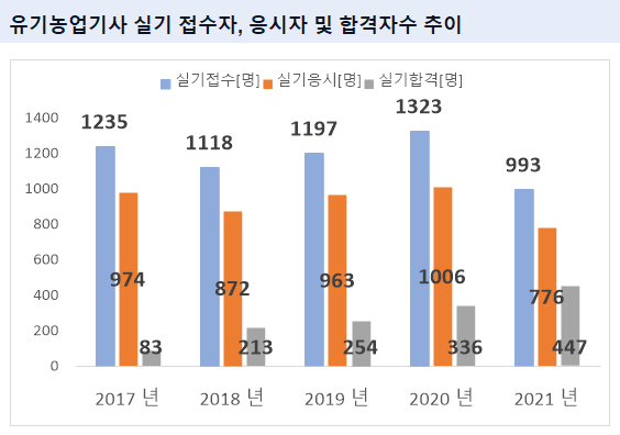그리고, 유기농업기사 필기시험에 최종 합격한 유기농업기사 필기 합격자수는 2021년 기준 571명 입니다.