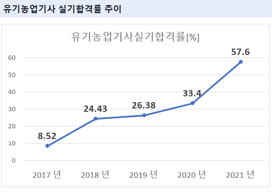 2021년 기준 유기농업기사 실기 합격률은 57.6% 입니다.