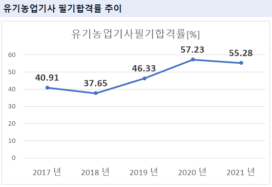 유기농업기사 필기시험 합격률을 보면 2021년 기준 55.28%의 합격률을 기록하였습니다.