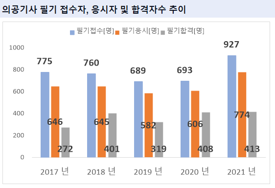 2021년 기준 의공기사 필기시험 접수자는 927명 이었으며, 이중 실제로 의공기사 필기시험에 응시한 응시자수는 774명 입니다.