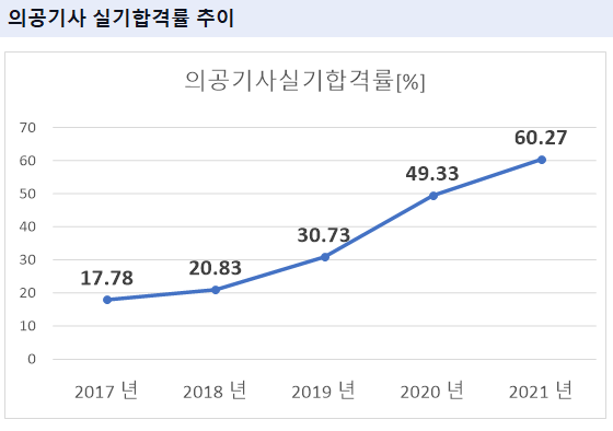 2021년 기준 의공기사 실기 합격률은 60.27% 입니다.