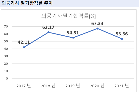 의공기사 필기시험 합격률을 보면 2021년 기준 53.36%의 합격률을 기록하였습니다.