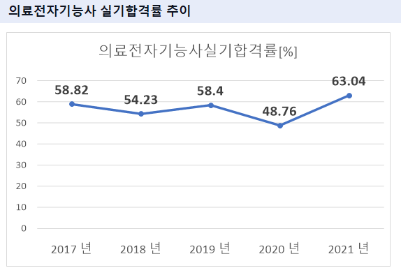 의료전자기능사 필기시험 합격률을 보면 2021년 기준 64.12%의 합격률을 기록하였습니다.