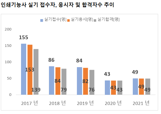 그리고, 최종적으로 인쇄기능사 실기시험에 합격한 인쇄기능사 실기시험 합격자수는 2021년 49명 입니다.
